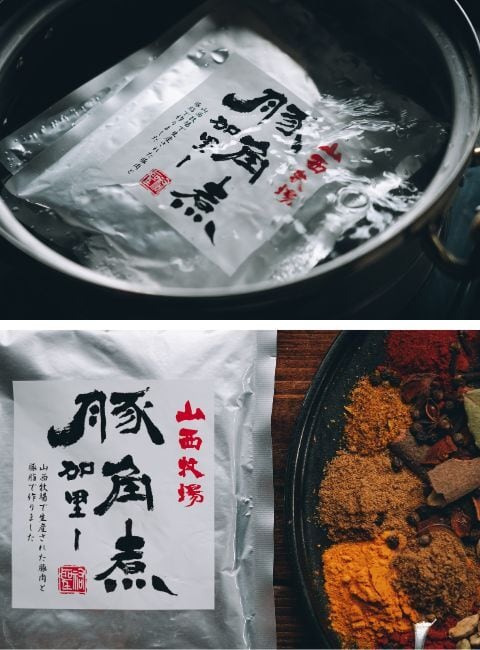 山西牧場の豚肉をふんだんに使用して作った、豚角煮という名前の通り角切りお肉ゴロゴロのポークカレーです。
