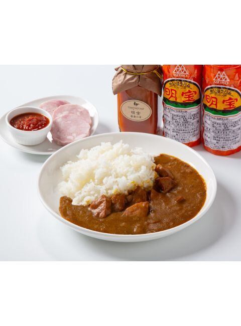 幻のハム「明宝ハム」を贅沢に使用し、岐阜県産完熟トマトの旨味がぎっしり詰まった食べ応えがる本格的なカレーです。