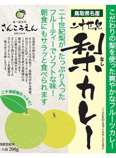 創業明治37年から100年以上続く梨専業農家「さんこうえん」が栽培にこだわって作った二十世紀梨を60%も入れ食感と風味を生かした本格的なカレーです。